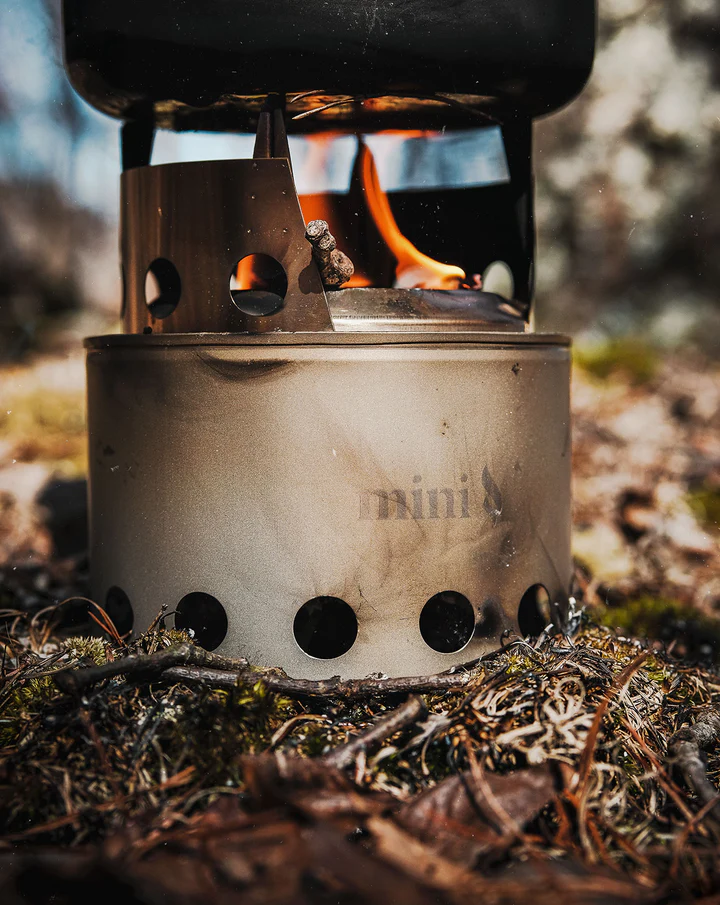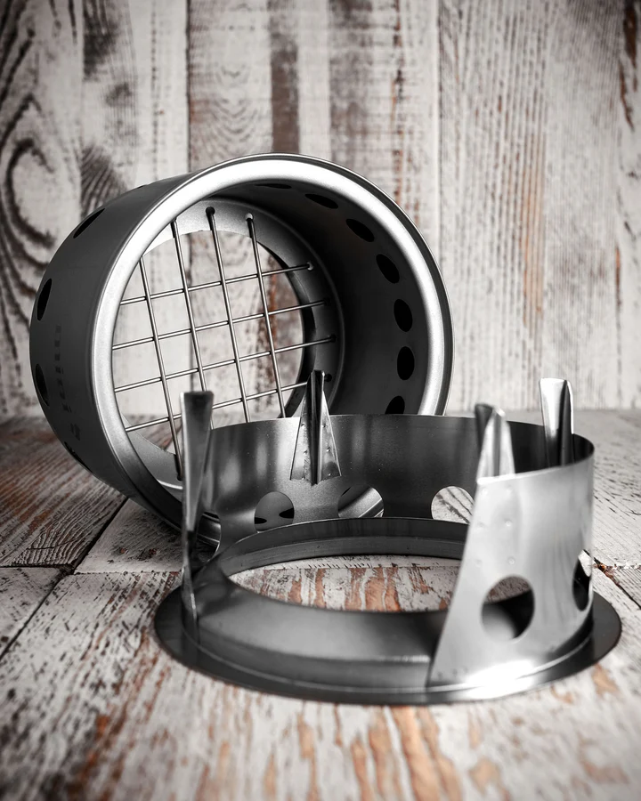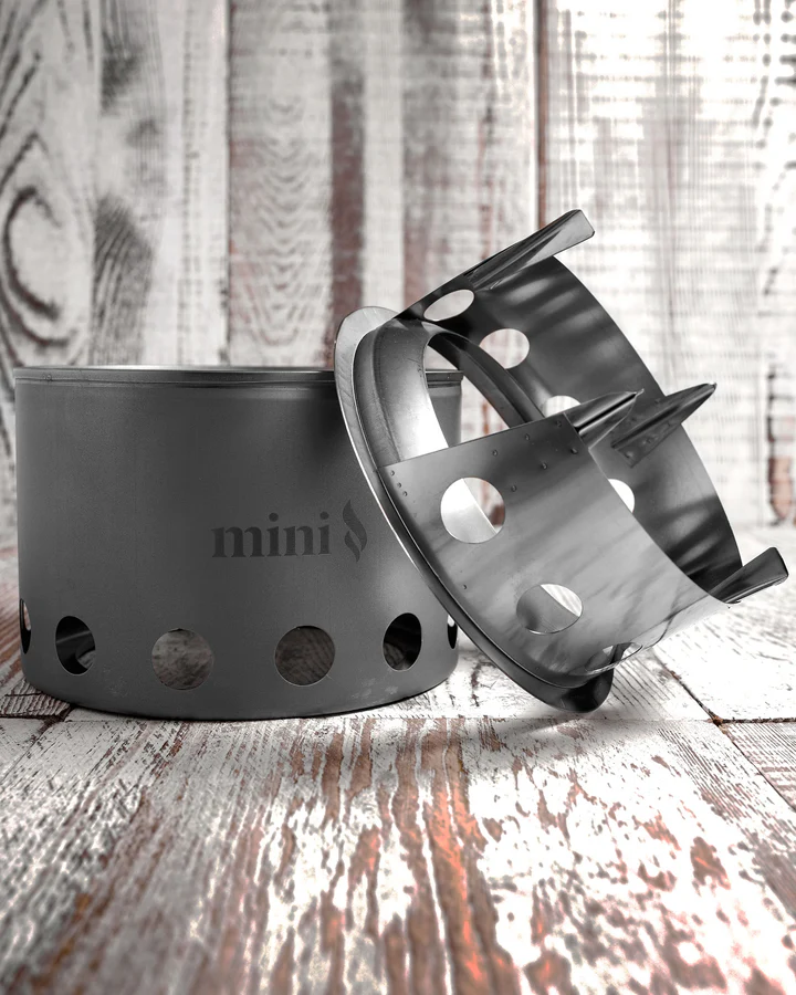 The Bushbuddy Mini Camp Stove is an ultralight wood stove for solo camping. The improved burn of its double-wall design, allows the stove to use less wood than regular wood stoves.