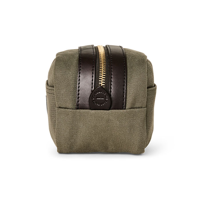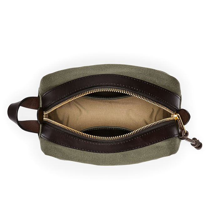 The Filson Rugged Twill Travel Kit is made with heavy-duty bridle leather and rugged twill and lined with waterproof nylon.